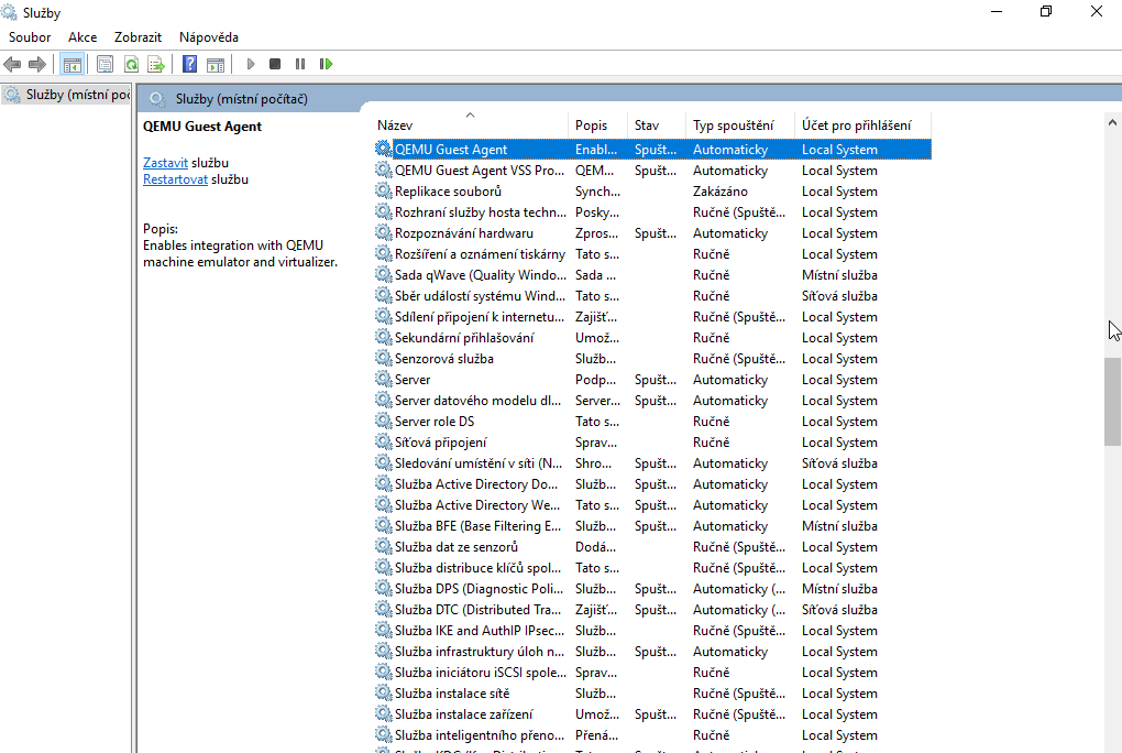 Kontrolu funkčnosti můžeme provést pomocí správy služeb systému (příkaz pro spuštění správce zařízení z příkazové řádky: services.msc). Služba QUEMU Guest Agent musí běžet.